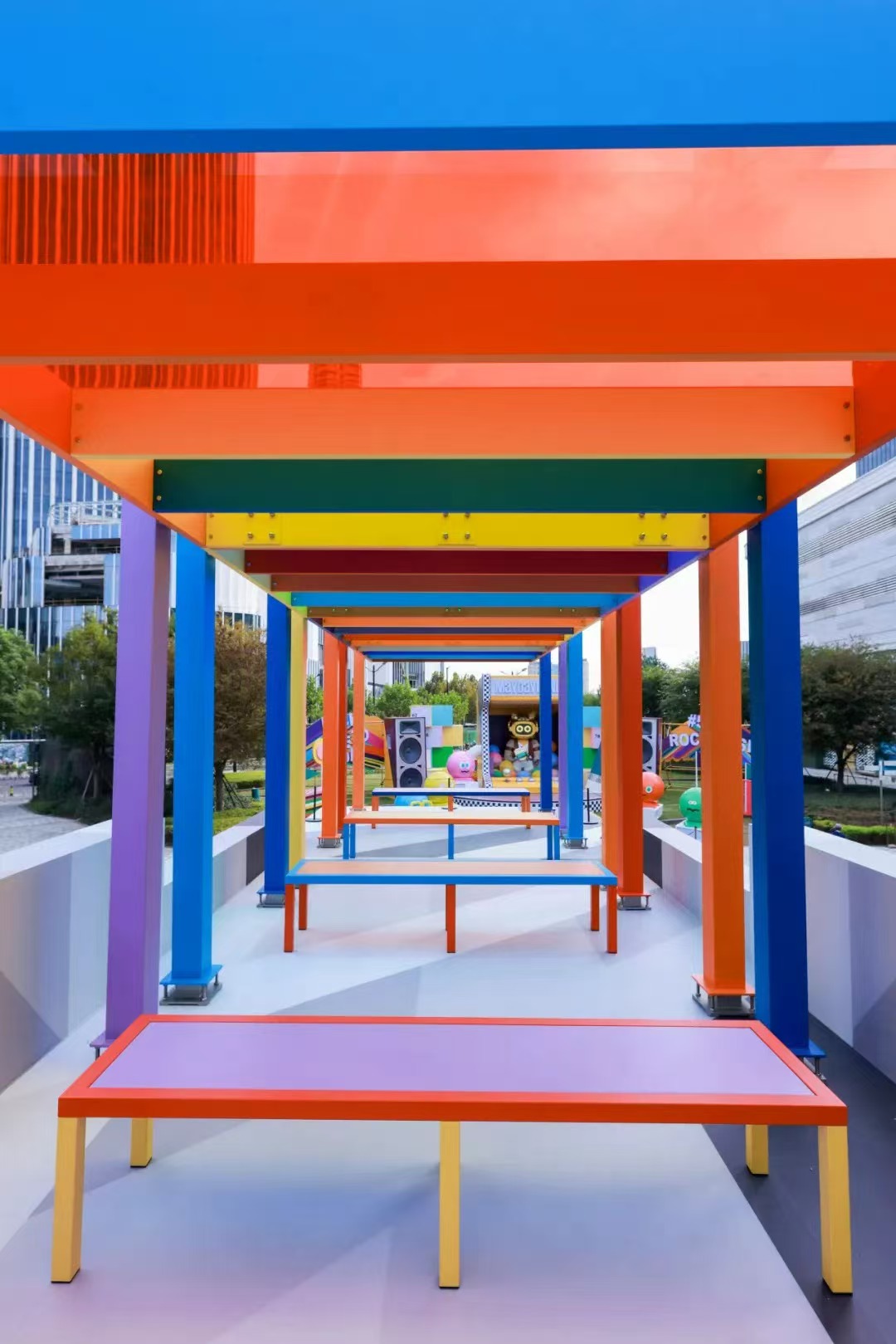 利亚姆·吉利克,《永续论台(Perpetual Discussion Platforms)》,2025,粉末涂层不锈钢、亚克力,240 × 960 × 280 厘米,装置尺寸 © 利亚姆·吉利克